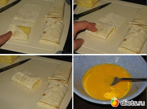 4. Каждый ломтик сыра обернуть полоской лаваша, окунуть в яйцо и обжарить по 3-5 минут с двух сторон на сковороде с маслом. Жарятся очень быстро.