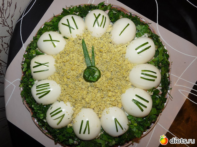 Варим яйца вкрутую, остужаем и очищаем от скорлупы. Разрезаем каждое яйцо вдоль на две половинки и вынимаем желтки. Натираем желтки на мелкой терке. Белки выкладываем по кругу так, чтобы выпуклая сторона была наверху. В центр салата насыпаем измельченные желтки.