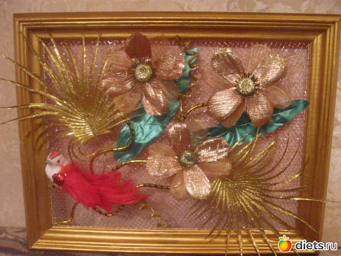 * Рамка для картины, сетка для цветов, искусственные цветы, ветки, птичка, пистолет с клеем.