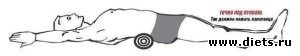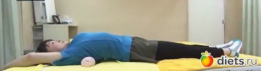 3. Аккуратно опускаемся на спину, придерживая валик руками так, чтобы он оказался поперек тела под поясницей – ровно под пупком. Это важно.