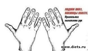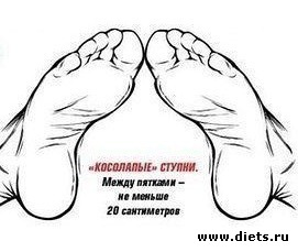 4. Ноги кладем на ширину плеч и «косолапо» сводим стопы вместе – так, чтобы большие пальцы касались друг друга, а пятки были на расстоянии 20–25 сантиметров.