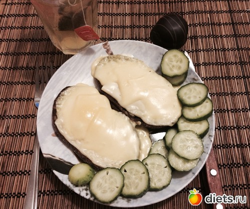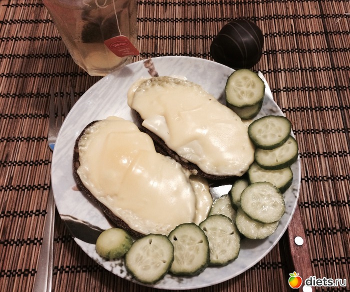 Утром нужно было выпить обезболивающее, на пустой желудок я себе этого позволить не могла, поэтому завтрак - 2 горячих бутерброда на темном хлебе с тыквенными семечками и двумя видами сыра, огурец, пирожное с клубничной прослойкой