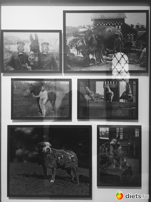 Смешных животных, которые сыграли непоследнюю роль в той войне. Собаки-санитары, голуби с собственными фотоаппаратиками, лошадки и ослики в противогазах...