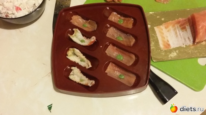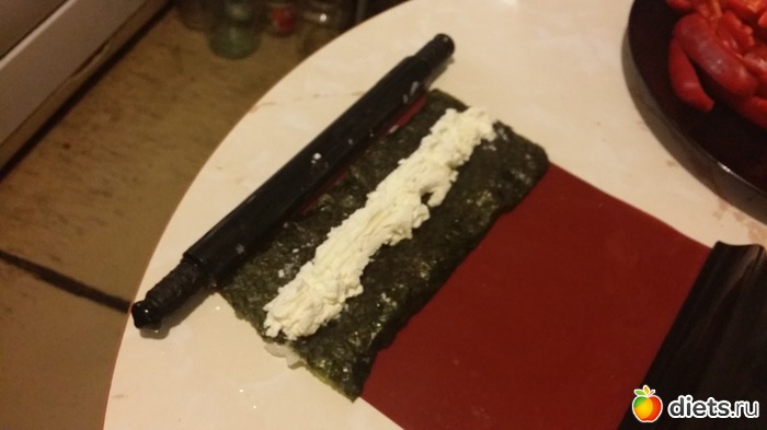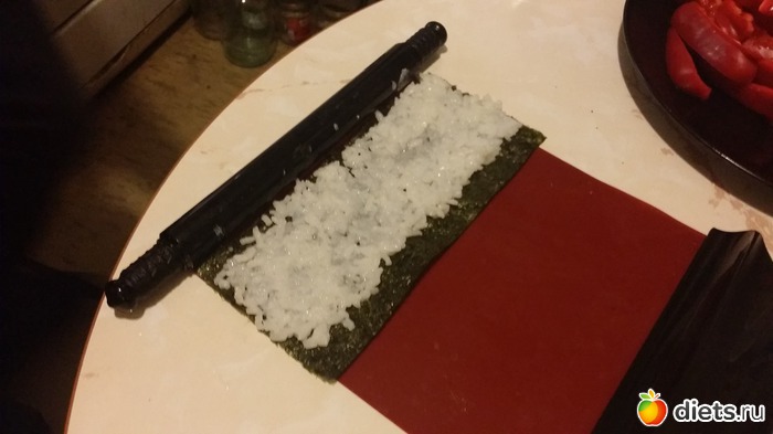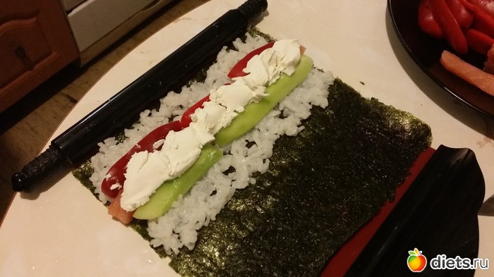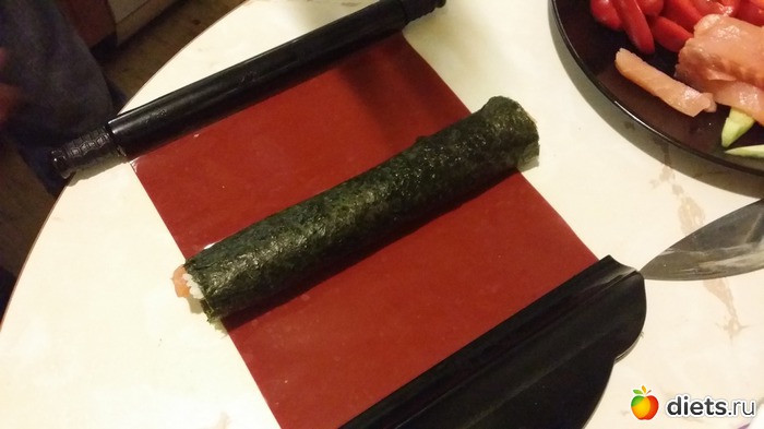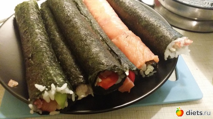 Скрутила роллы с разными начинками. Тут все просто. Положила на коврик листик нори, тоненько разложила рис, потом начинку и скрутила. Первый раз крутила с помощью этого коврика - очень удобно, просто и быстро. Раньше всегда крутила циновкой - мороки конечно ощутимо больше