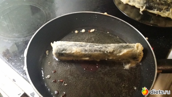 Для приготовления кляра высыпала муку в глубокую емкость. Взбила яйцо с водой. Постепенно перелила в муку полученную смесь и быстренько все размешала. Тесто для кляра получилось по густоте похожим на кисель. По рецепту нужен сотейник, в котором надо разогреть оливковое масло. Сотейникау меня с некоторых пор нету, поэтому обошлась обычной сковородкой. Роллы сначала обваляла в муке, потом окунула в кляр