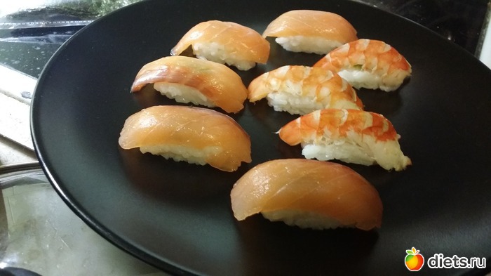 Я же неудержалась и приготовила негири суши с помощью формочек из того же набора. Порезала рыбку, надрезала вдоль королевские креветки, капнула васаби для остроты...