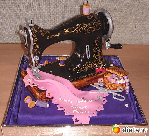 Если это тортик «Швейная машинка», то здесь вам и традиционные золотистые завитки «зингеровских» узоров, и катушки с ножницами на ажурной салфетке, и крохотная шкатулка с пуговками и бусинами.