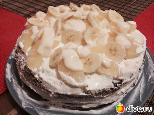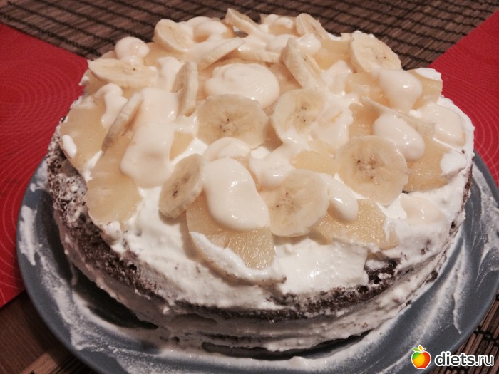 Конечно, коржи он купил, но все остальное сделал сам: вкусный крем из творога и йогурта, украсил бананами и ананасом.