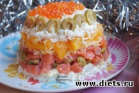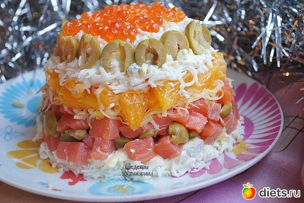 3) Салат украсить сверху красной икрой и оливками.