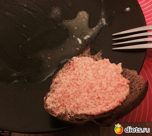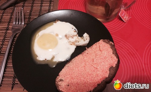 1,5 бутерброда с икрой мойвы, 1 яйцо на сухой сковороде