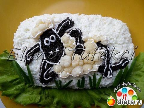 Салат "Барашек Шон" - украшен веселым героем из мультфильма, который является символом наступающего Нового Года. Салат очень вкусный, неизбитый по составу и довольно легко готовится.