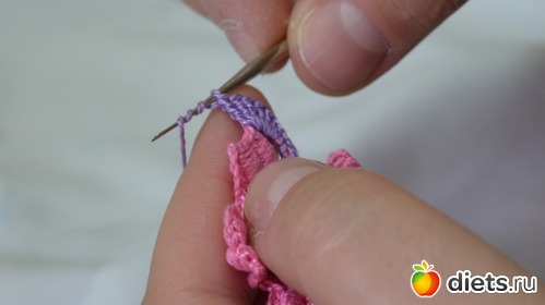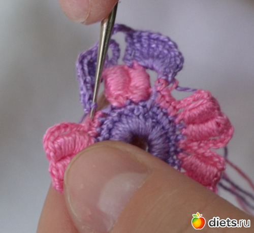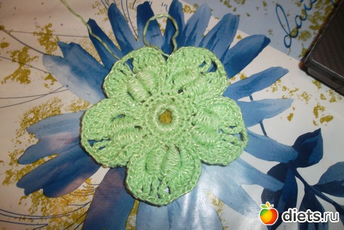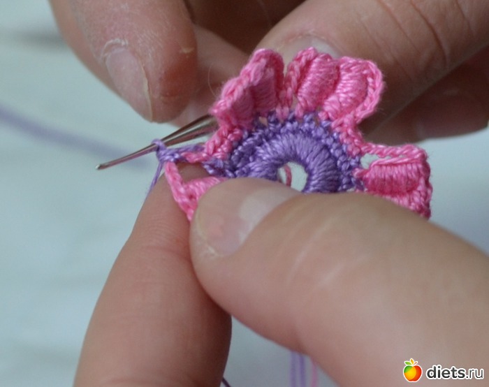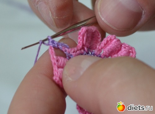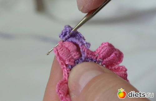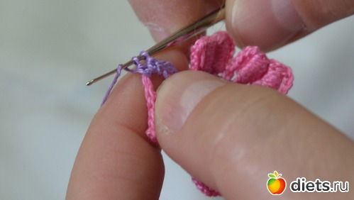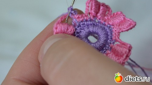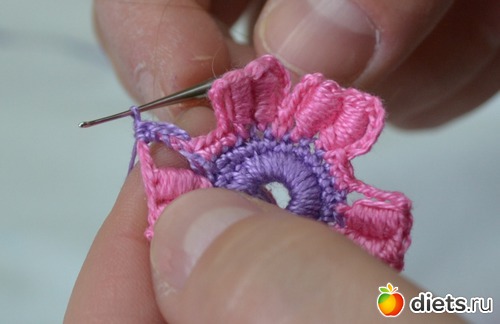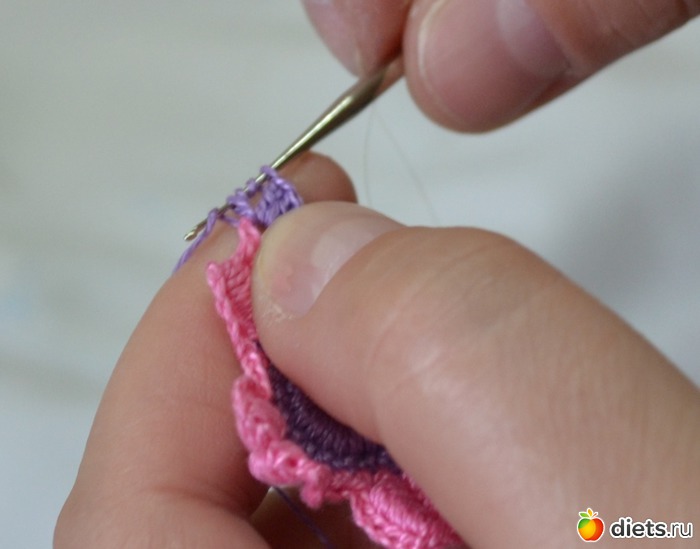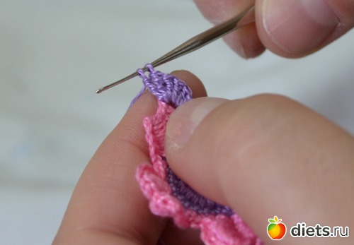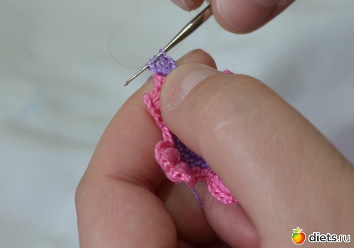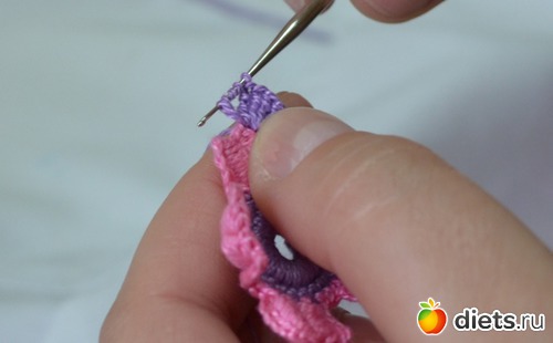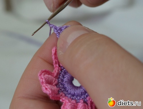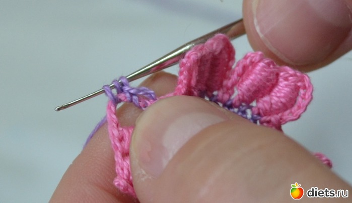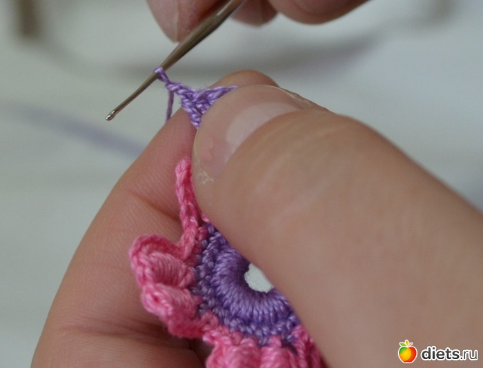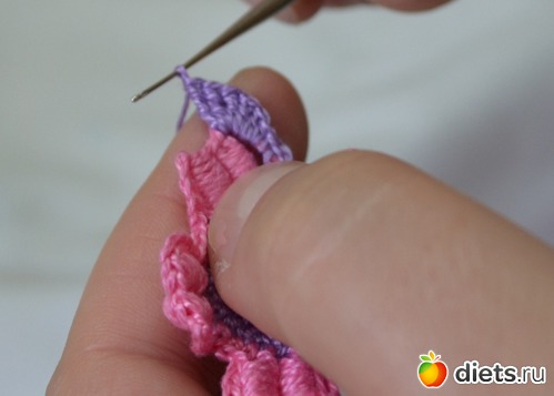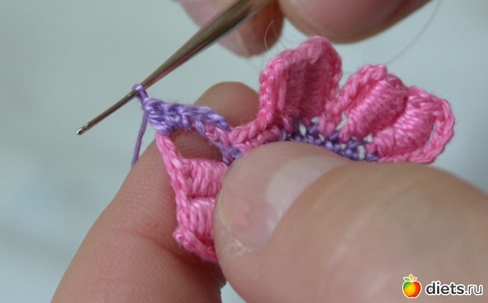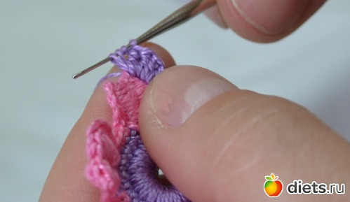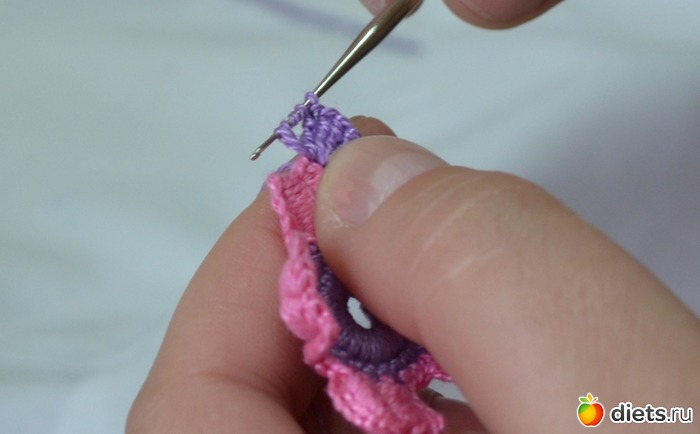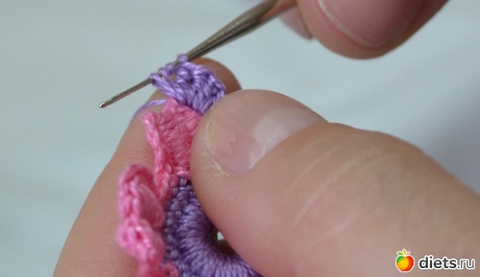 Помните между лепестками у нам было три столбика без накида. В это ряду между лепестками делаем один столбик без накида