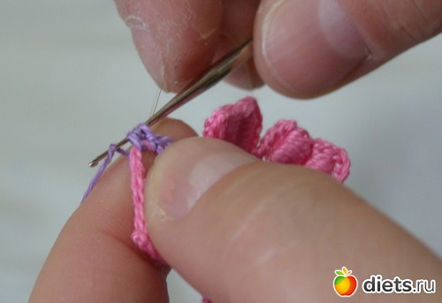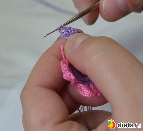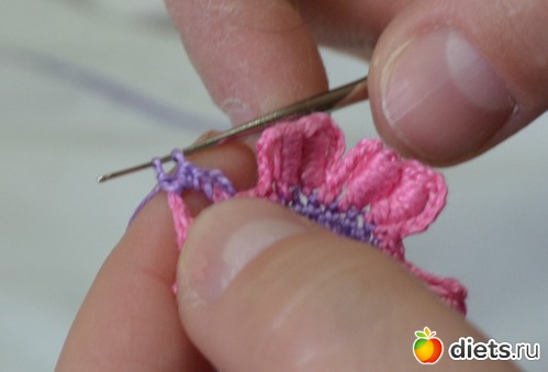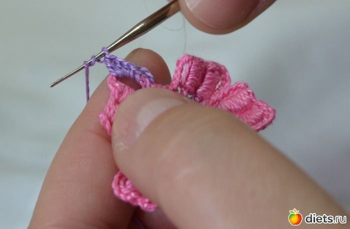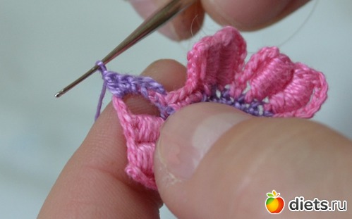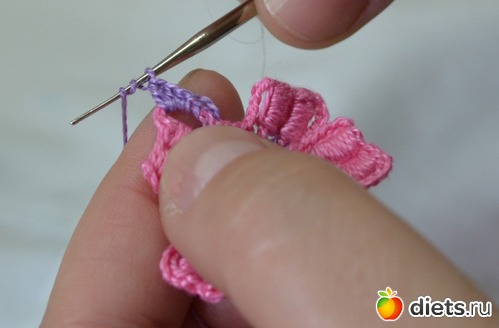 Нам нужно сформировать наши лепестки. Делаем петельки под "бочок" лепестка (это наши 6 воздушных петель)