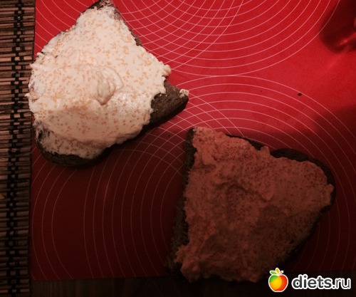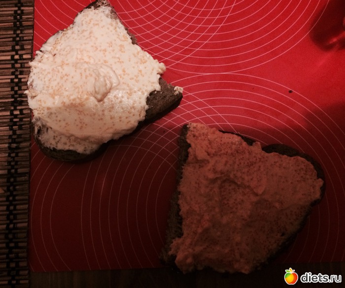На завтрак были две половинки хлеба (итого - 1 кусочек) с икрой мойвы разных сортов