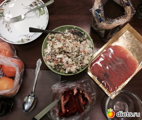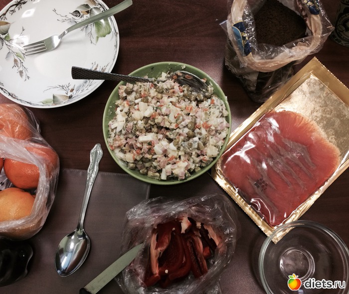 В обед мой аппетит нисколько не убавился и в 13.30 я в компании небольшой группы соседних коллег съела тарелочку оливье, 2 бутерброда с красной рыбой и перчи