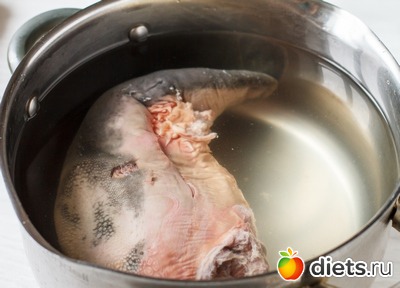 Язык тщательно моем (скоблим, удаляем загрязнения), кладем в большую кастрюлю и заливаем водой так, чтобы она полностью покрывала язык +5 см сверху.