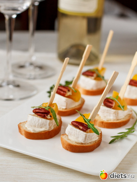 Вместо консервированного персика здесь хорошо сыграет груша или четвертинка свежего инжира (вариант с инжиром будет, кстати, наименее сладким). Камамбер здесь взаимозаменяем с бри. А вот рукколой в этом блюде лучше не пренебрегать - она придает канапе особый пикантный (но при это легкий) оттенок вкуса.