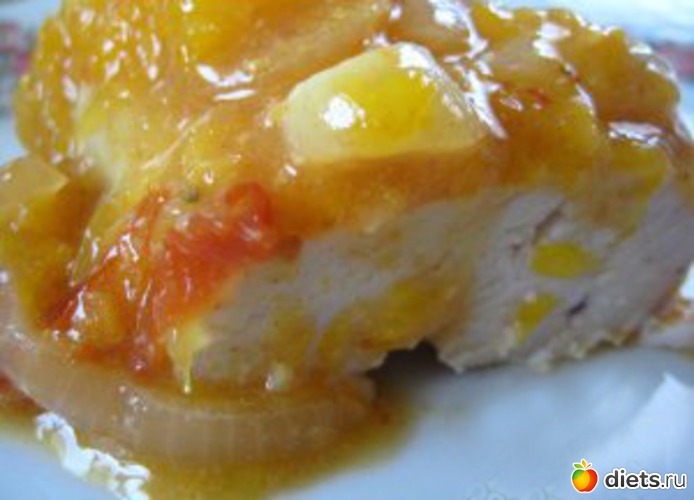 В огнеупорное блюдо выкладываем нарезанную кусочками вторую половинку апельсина, мелко нарезанные помидоры, заливаем маринадом, выкладываем грудки, и запекаем в духовке, разогретой до 200°C