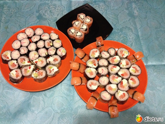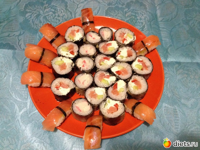 Осталось только нарезать наши роллы и можно подавать к столу. Тэмпура роллы надо подавать теплыми - так они намного вкуснее. Нигири я перевязала для красоты тоненькими полосками нори. А Филадельфия в этот раз получилась какая-то неровная, но все равно очень вкусная - главное, не жалеть начинки