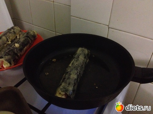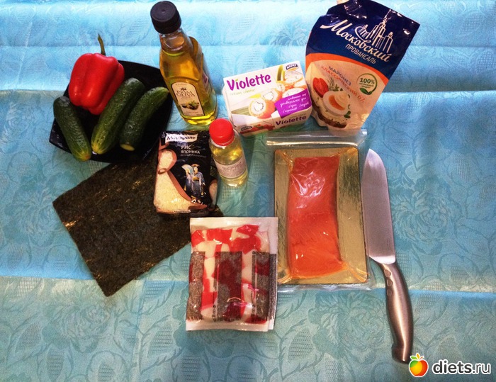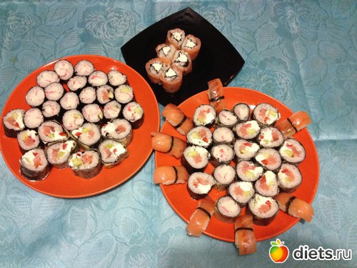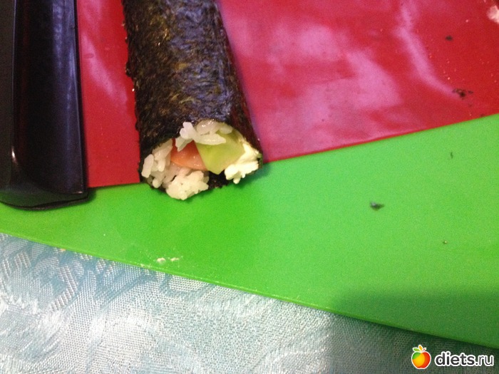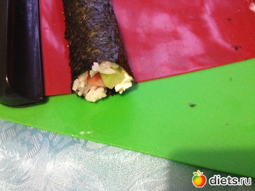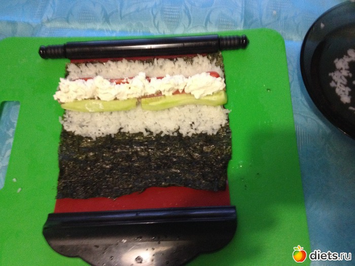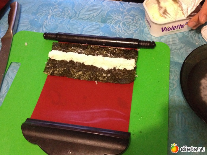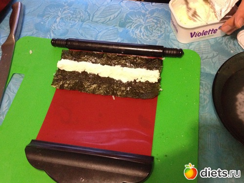 Проделываем те же операции для разных начинок (не боимся экспериментировать, иногда получаются очень неожиданные вкусы - например, очень понравился ролл с имитацией крабового мяса и огурчиком). Чтобы скрутить любимый многими ролл Филадельфия, надо сначала скрутить ролл рисом наружу. Для этого берем половинку листика нори и выкладываем на ней тонким слоем рис