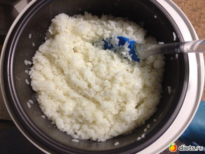 После добавления заправки перемешиваем рис, чтобы он равномерно пропитался и оставляем его в покое - остывать до комфортной температуры