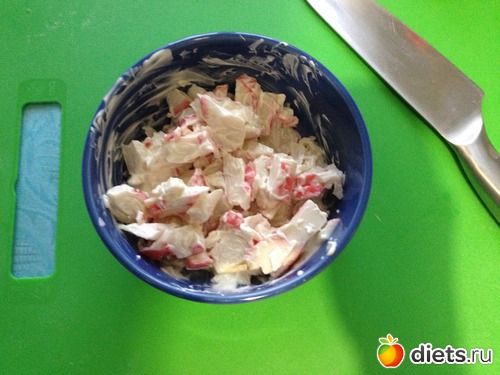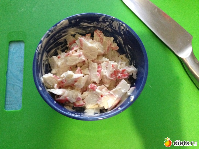 Готовим начинку по классической схеме. Огурец и перец режем соломкой. "Крабовое мясо" измельчаем ножом и смешиваем с небольшим количеством майонеза