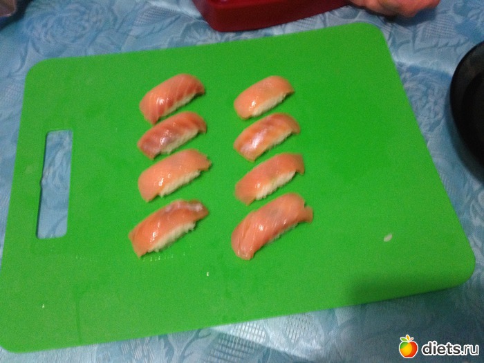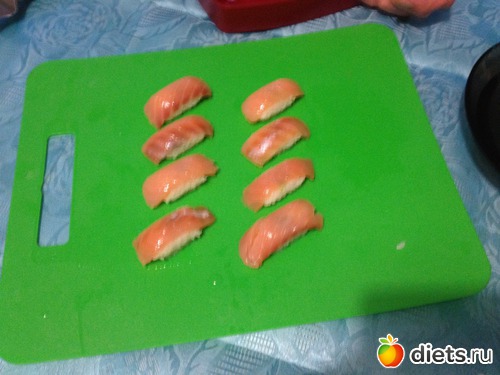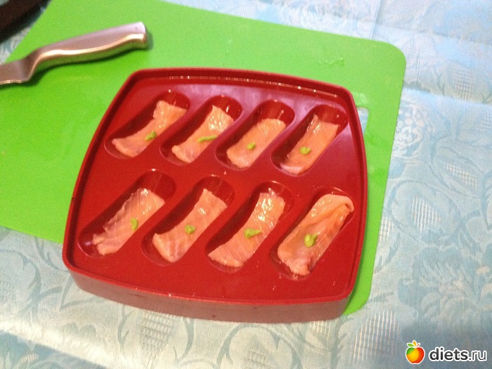 ). Укладываем рыбку, нарезанную примерно в размер 5х2см, добавляем для остроты васаби