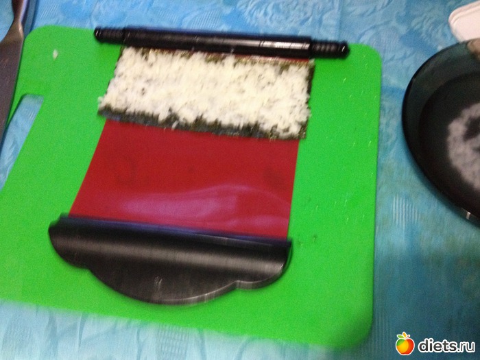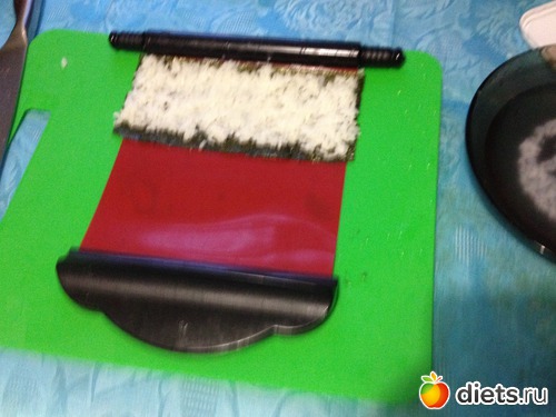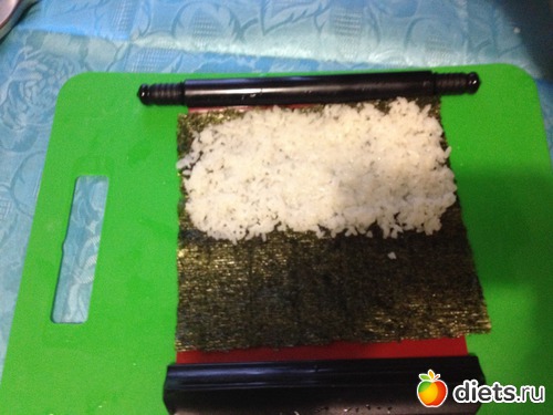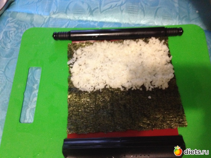 Переходим к роллам. Опять же - каждый волен крутить, чем ему удобно - кто-то по-старинке циновкой, кто-то - с помощью приспособлений. Берем коврик, выкладываем рис нори, на половинку листа нори распределяем тонким слоем рис