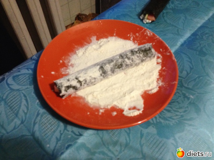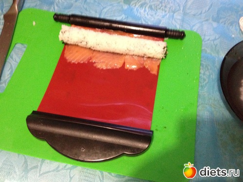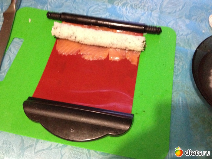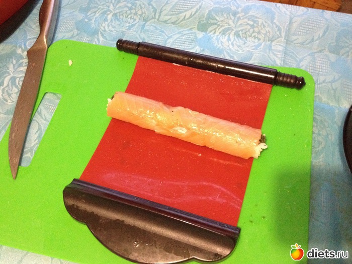 Сворачиваем и получаем наш ролл рисом наружу, который теперь нам надо просто завернуть с помощью все того же коврика с тонкие пластины семги (кто делал это с помощью циновки, помнит пляски с пищевой пленкой на этом этапе