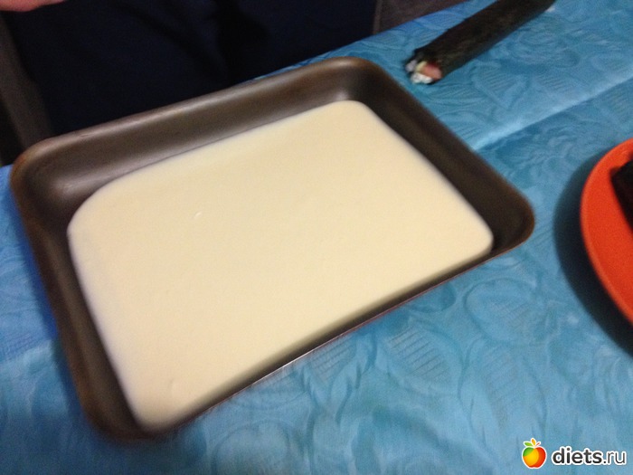 Выливаем ее в длинную емкость, в которой нам удобно будет обмакивать роллы