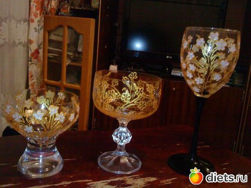 Приветик всем))) Я в отпуске)) Занимаюсь зубками, драю квартиру и расписываю бокальчики и креманочки из богемского стекла в подарок моим друзьям - это еще недоделанные до конца, но мне и детям моим нравятся, сделанные с любовью и душой)))