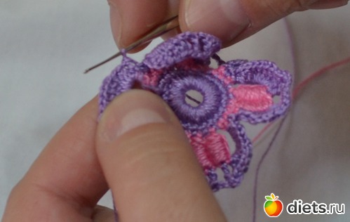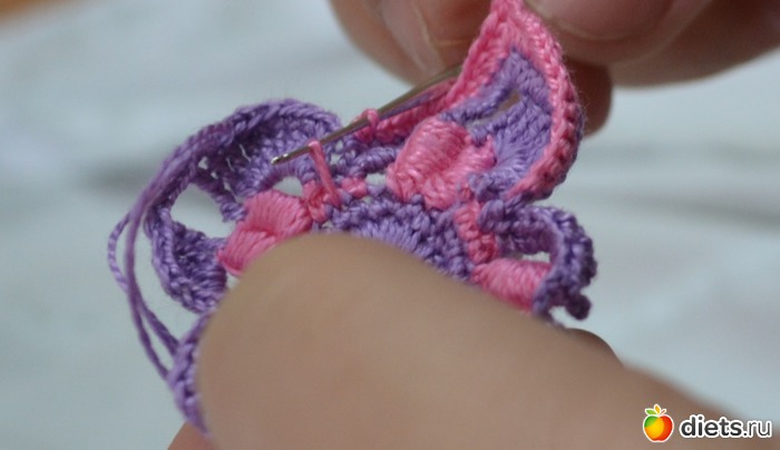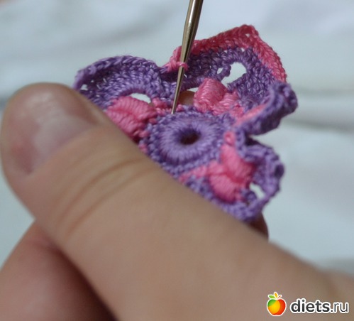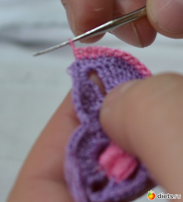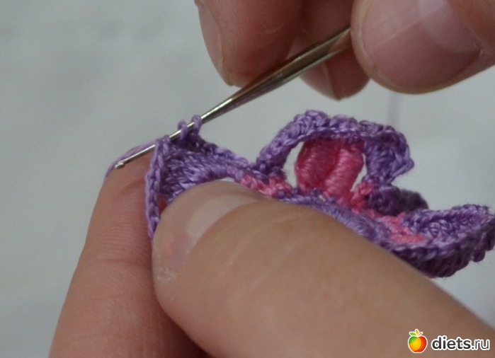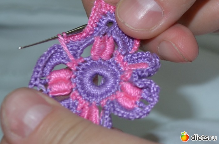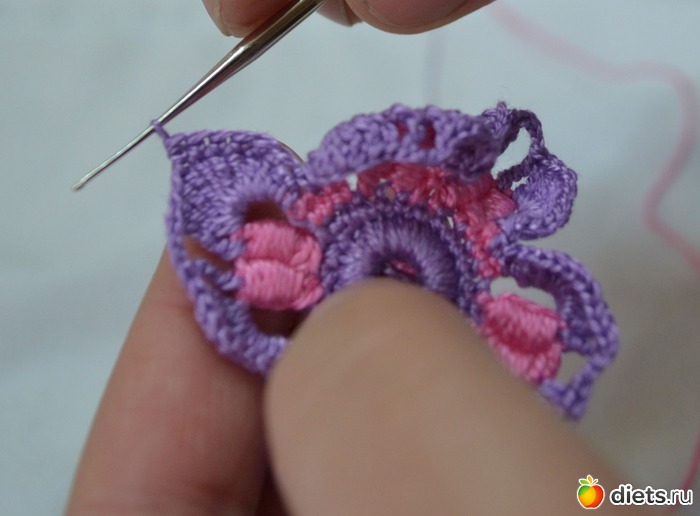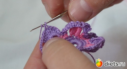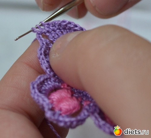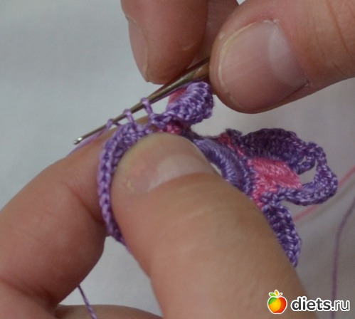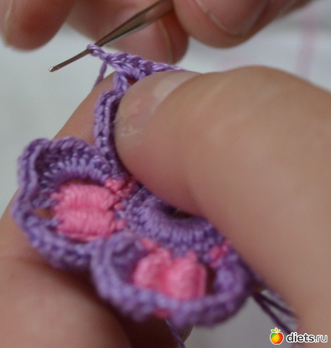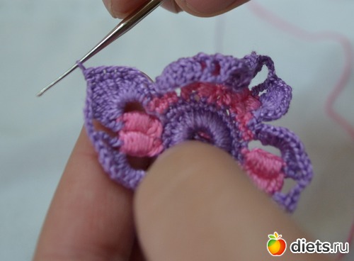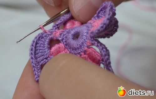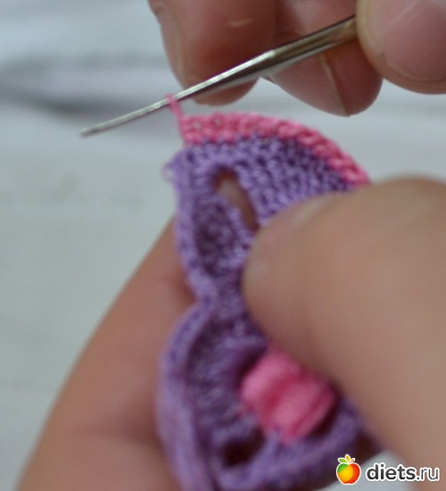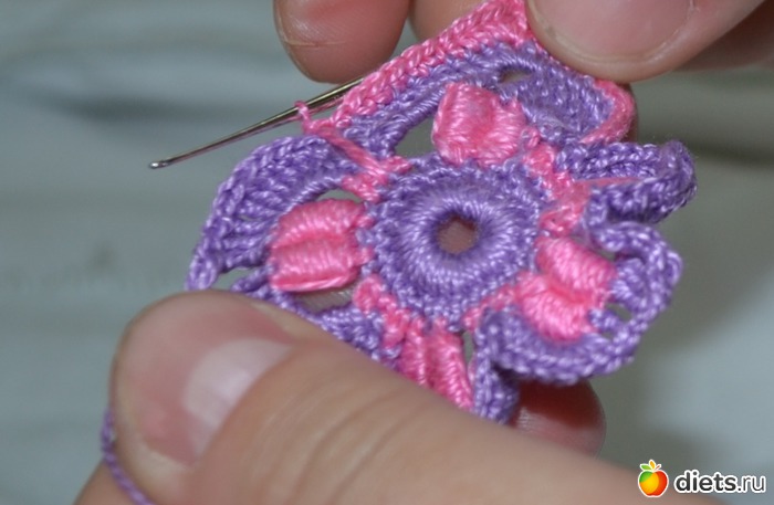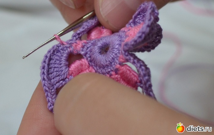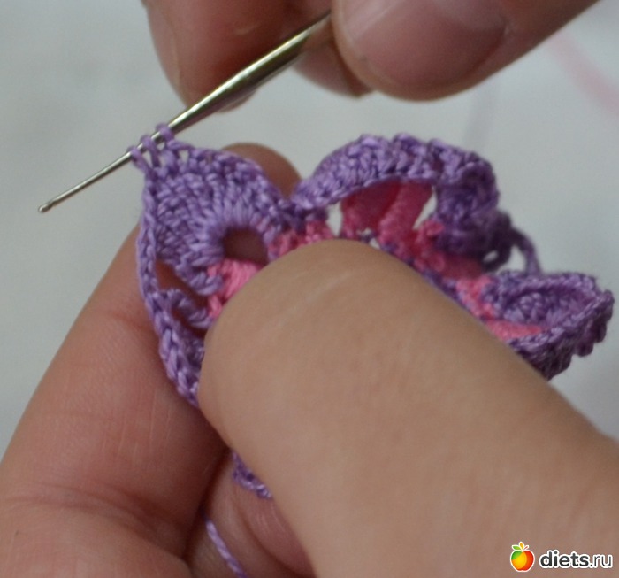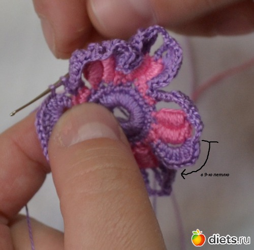 Вяжем наши петельки и петли нижнего ряда. Начинаем в девятую петлю от верхушки лепестка