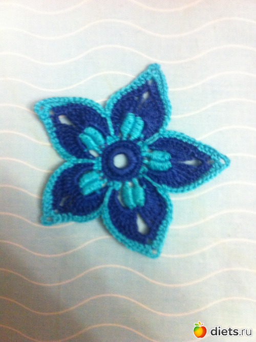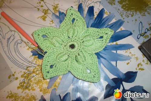 5. И все в обратном порядке делаем вторую сторону лепестка (три полустолбика с накидом под воздушные петли, три полустолбика с накидом в петли нижнего ряда, пять столбиков без накида)