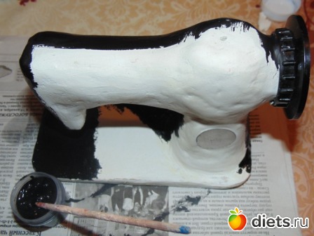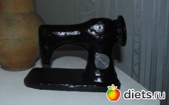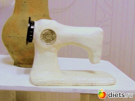 10. Приклеиваем машинку к основанию клеем, замазываем шов в месте соединения машинки и основания, прикладываем что-то круглое и металлическое на корпус (я использовала на одной стороне заднюю стенку от старых наручных часов, а на обратной стороне брелок с узором) в местах для регулирования стежка и тоже промазываем шов по кругу.