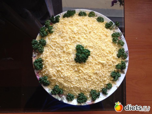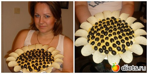 1 сл - куриное филе отварное+майонез, 2 сл - шампиньоны +майонез, 3 сл - белок, на белок тертый сыр+майонез, 4 сл - желтки натертые на мелкой терке равномерно распределить. На желтки выложить половинки маслин и выложить чипсы по краю.