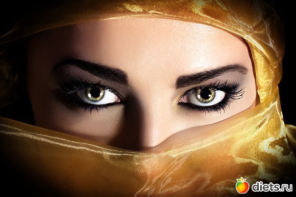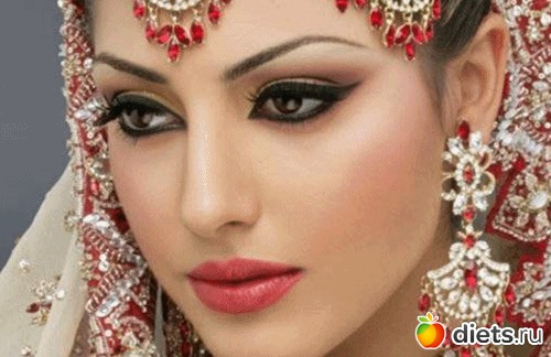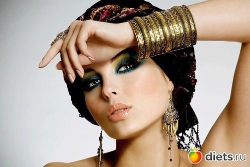 Восточный макияж для карих глаз подразумевает использование теней темно- коричневого, бронзового, изумрудного, оливкового, синего, фиолетового, бежевого, розового, сливового и сиреневого цветов. Завершает восточный макияж карих глаз пышные накладные ресницы.