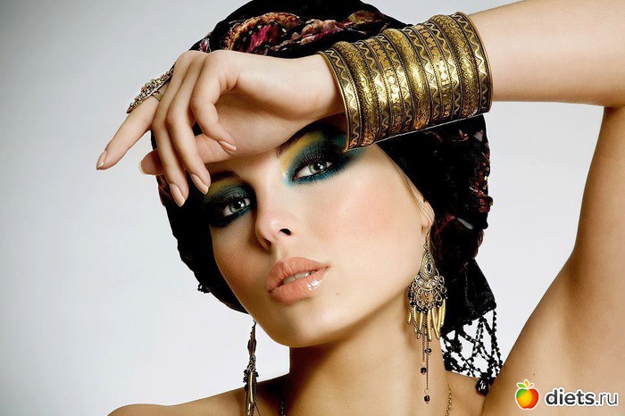 Чтобы не перегружать образ не стоит использовать румяна. Восточный макияж для серых глаз в точности повторяет рекомендации для голубоглазых красавиц.
