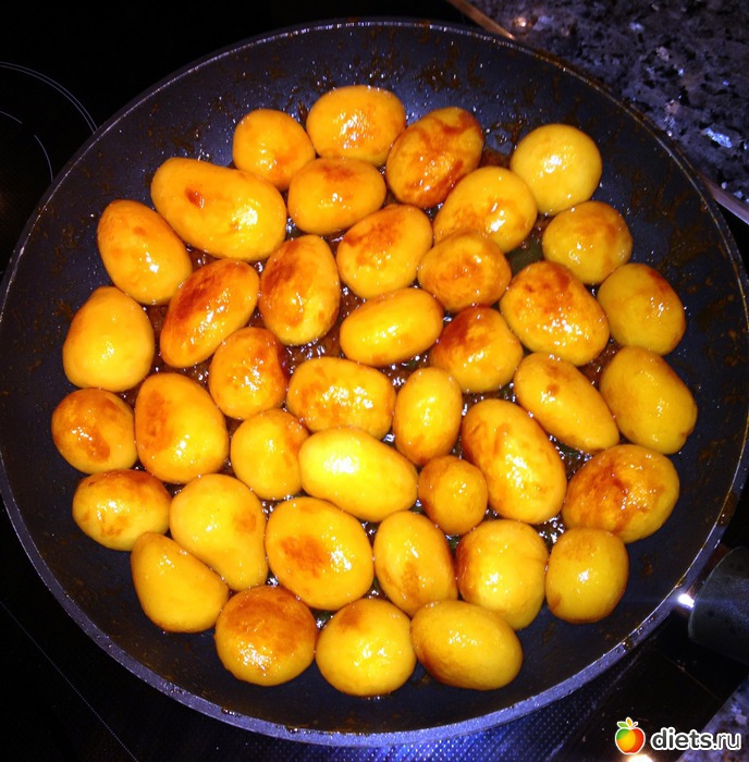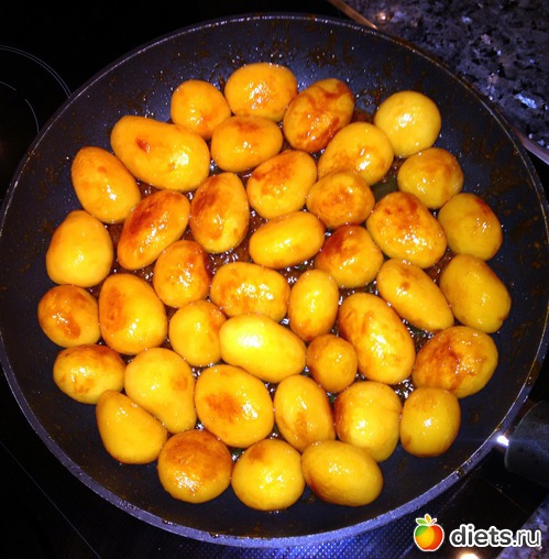 Отвариваете картошку, может совсем чуть-чуть не доварить. На сковореде растапливаете 2 - 3 ст.ложки сахара. Когда сахар станет жидким и коричневым, добавляете кусок сливочного масла, и бросаете туда картошку. А дальше минут 8 - 10 обжариваете в этом соусе. Мешать картошку не нужно. Просто трясете периодически сковороду и она сама переворачивается. Идея - просто придать очень аппетитный вид. Вкус, конечно, тоже меняется, но не настолько, чтобы испугаться слова "сахар"