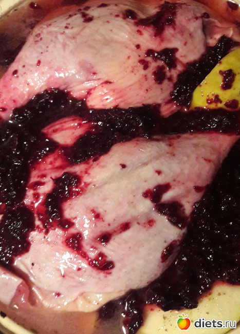 Но, конечно, с курицей вкус получается совсем другой. Во-первых, с утки в соус сойдет много жира, что уже вкус соуса разбавит. Во-вторых, утка в любом случае будет больше курицы. Соответственно больше и соуса в себя впитает. Конечно, не обязательно выливать всю бутылку вина. И можно соус разбавлять водой. Главное правило когда готовишь - нужно пробовать! И если от сырой курицы кусок оторвать не получится чтобы попробовать, то с соусом нет проблем. Кроме кубиков Кнорр или Магги туда можно добавить по вкусу перец (я добавляю смесь из 5 перцев - специй), сахар, соль, загуститель соуса, который тоже имеет свой вкус и т.д. И если соус получается черезчур алкогольный, то разбавить водой. Пробовать нужно ближе к окончанию чтобы джем успел дать сладость.