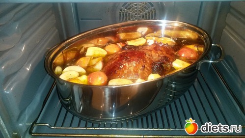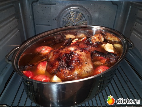 На фотке, где уточка в духовке, будет видно, что попочка треснула и яблоки немного выскочили наружу. Я когда ее зашивала, что видела, что там в одном месте кожица была немного повреждена (как бы растянута). Но не думала, что такая оказия может случиться, т.к. таких прецендентов раньше не было. Но вкус яблок это не испортило. Парочка выскочила в соус, где пропиталась так основательно вином. Те яблоки, что я добавляю в конце в соус, так сильно не успевают напитаться.