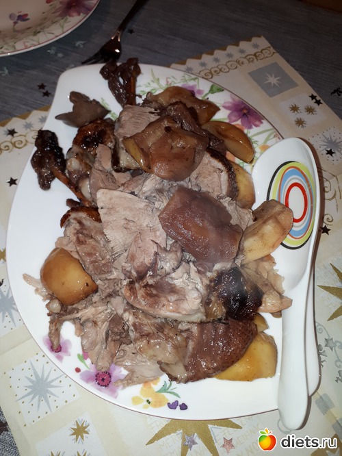 Свекровь всю жизнь утку на Рождество готовит. Но она всегда вовнуть клала яблоки и чернослив, готовила просто на протвине (не в соусе), отчего она всегда получалась жестковатой. Соус потом отдельно делала и подавала уже на стол. Я решила делать утку по-своему. Нашла несколько рецептов в Инете, соединила, добавила своё и ву а ля!