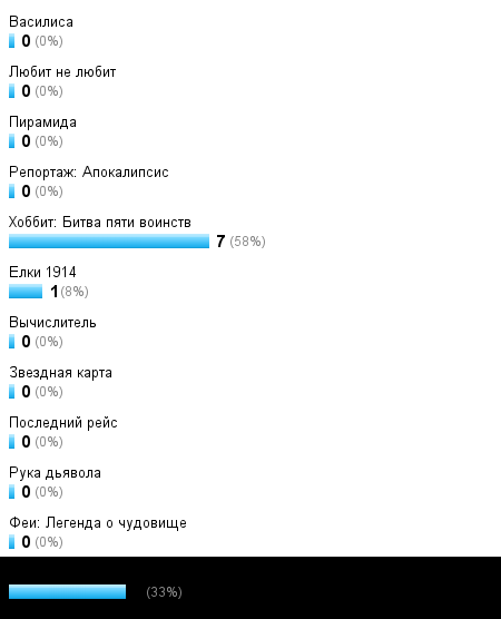 а хоббита так и не смотрела муж не захотел и я не стала) посмотрим какой фильм заработает больше очков может и хоббита посмотрю))