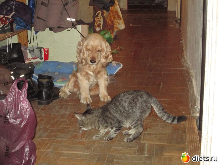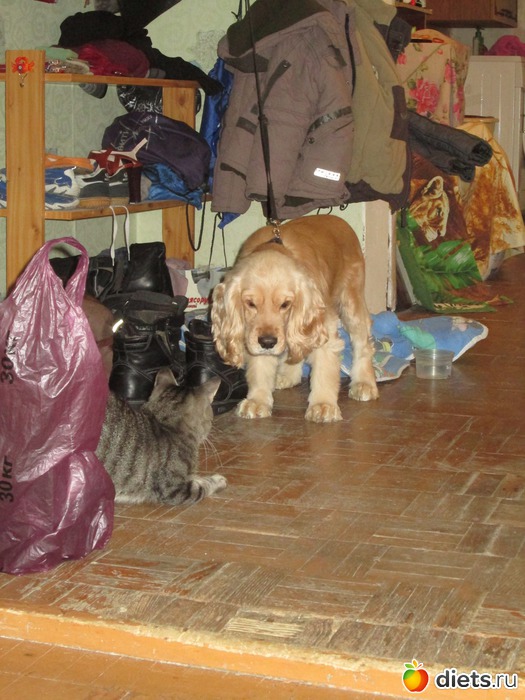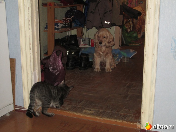 Приехали к нам гости...не одни... с собачкой. Собачку привязали в прихожей так как не знала как кот будет на неё реагировать... Вот вам знакомство с Боней