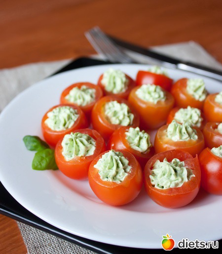 Все же знают рецепт помидоров с сыром и чесноком? Так вот это, если хотите, более здоровый и более совершенный рецепт этой закуски. Я готовила ее с помидорками черри, но за неимением крем можно выкладывать на кружочки обычных помидоров. Очень красиво и вкусно получается : ).