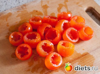 С помидорок срезаем верх и маленькой ложечкой аккуратно вынимаем внутренности.