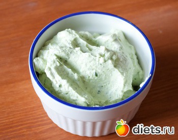 Базилик растираем с чесноком в пюре - это можно сделать в ступке или при помощи блендера. Смешиваем со сливочным сыром, соли по вкусу.