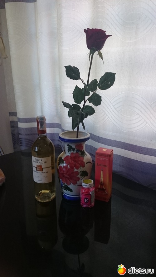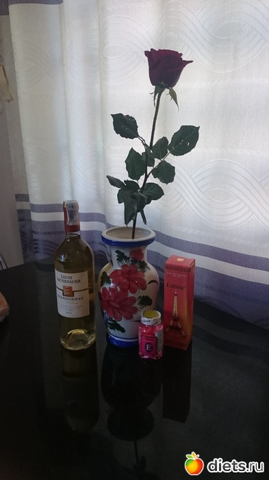 Забыла написать, утром приехала с океана, а на столе роза от мужа, потом он ещёездл мне за творогом и привёз бутылку вина.