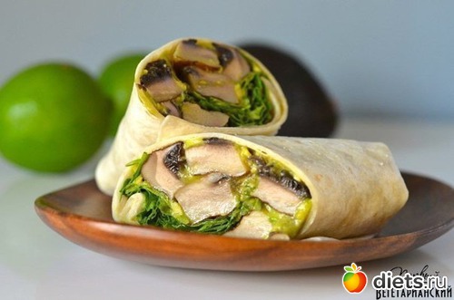 Авокадо разрежьте пополам, удалите косточку, очистите от кожуры. Мякоть разомните вилкой в миске. Мелко-мелко порубите чеснок, либо раздавите его в чеснокодавке и перемешайте с пастой из авокадо. Присолите и поперчите массу, добавьте острый перец и лимонный сок. Снова перемешайте. На лепешку, тортилью или лаваш выложите массу из авокадо и чеснока, на нее уложите грибы, а сверху зелень. Сверните рулетики или конвертики. Каждый рулетик дополнительно можно слегка обжарить с капелькой растительного масла.