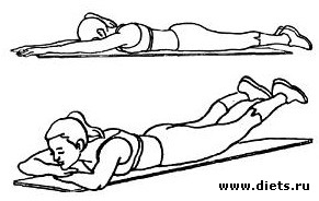 Упражнение 2. Исходное положение и выполнение: лежа на животе, кисти рук под подбородком или вытянуты вперед, поднимаем ноги над полом.