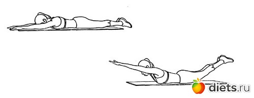 Упражнение 3. Исходное положение и выполнение: лежа на животе, кисти рук под подбородком или вытянуты вперед, поднимаем одновременно руки и ноги и разводим их в стороны.